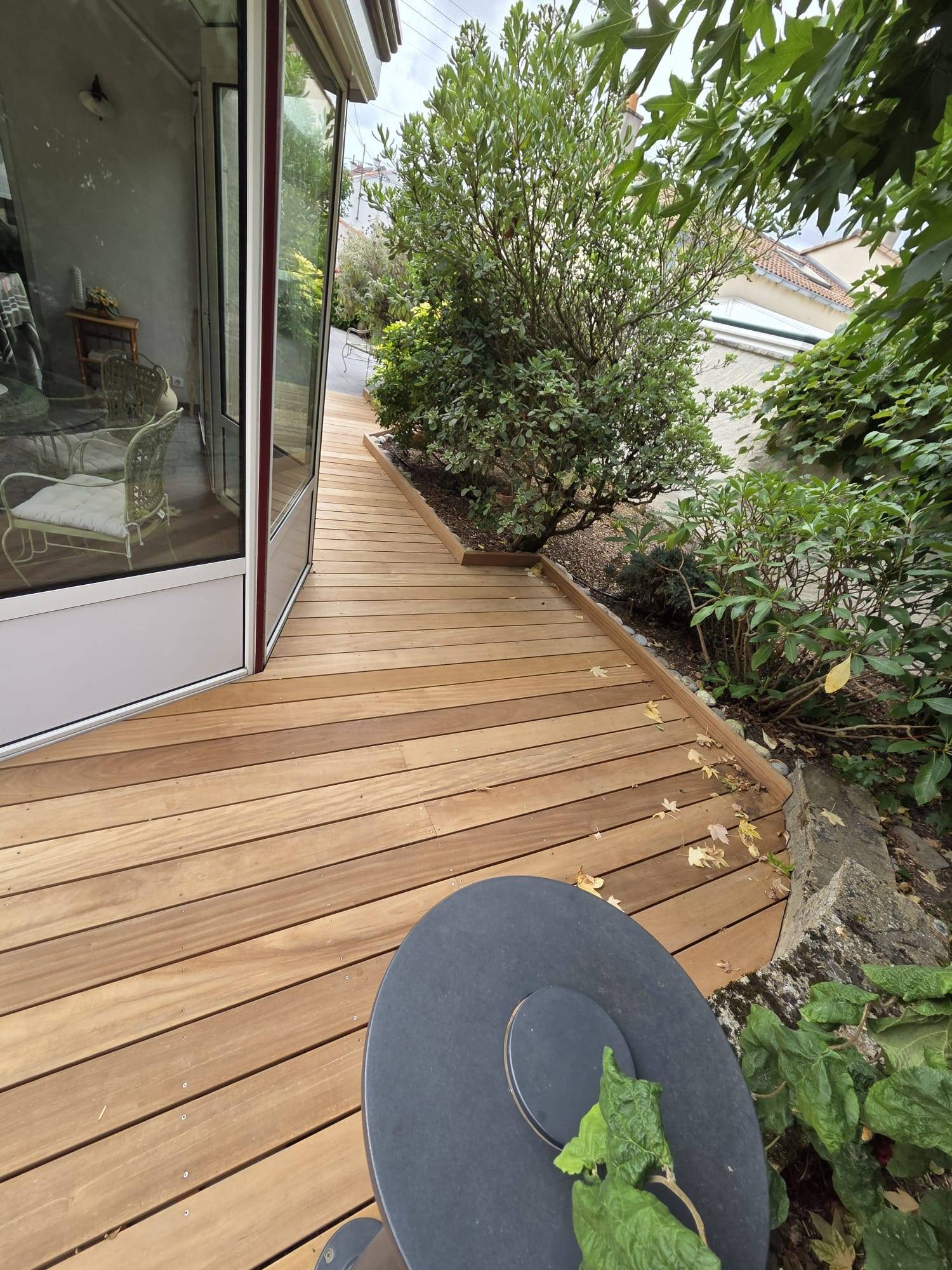 Notre équipe est intervenue pour déposer l’ancienne terrasse, vérifier la structure existante, puis remplacer entièrement les lames en bois exotique Garapa.